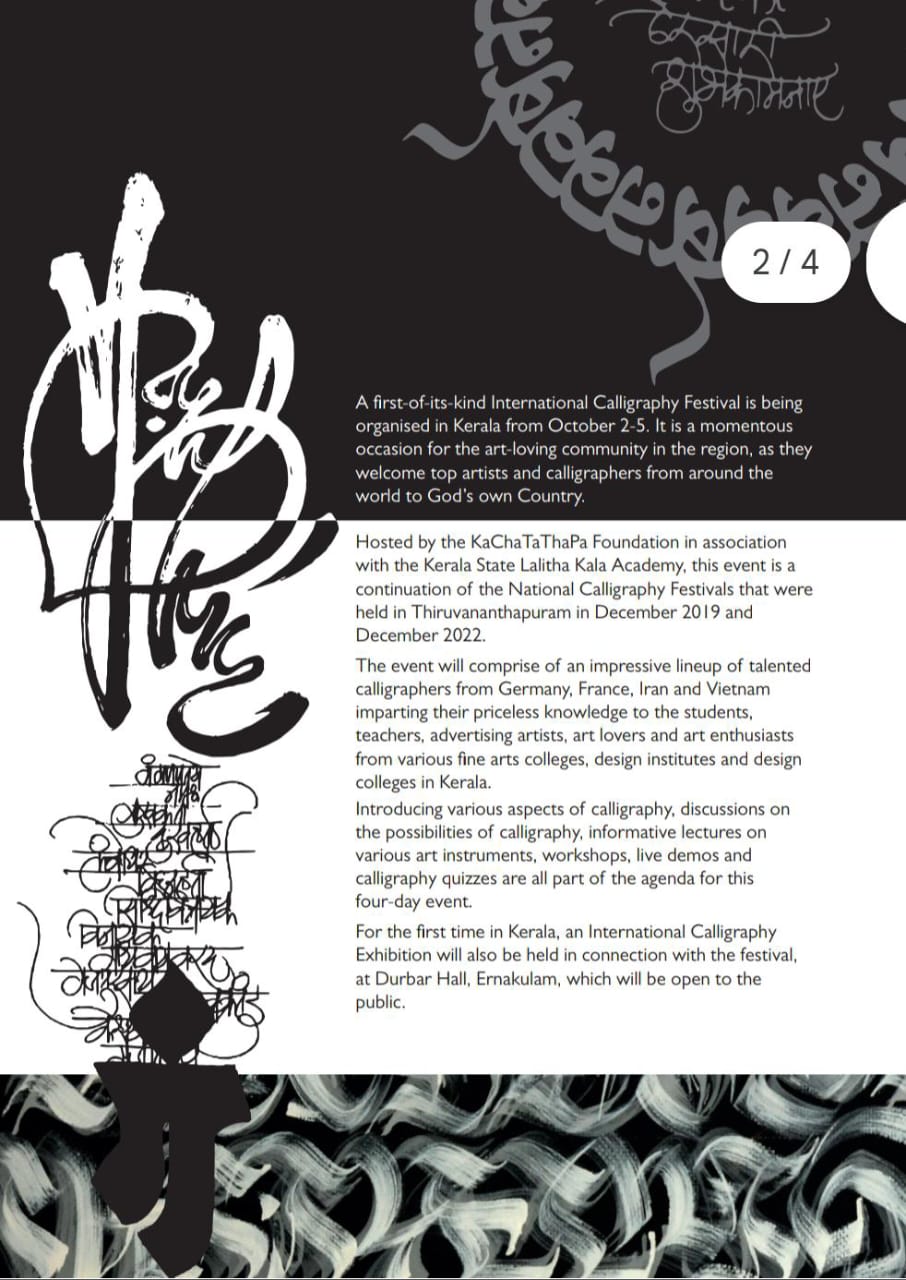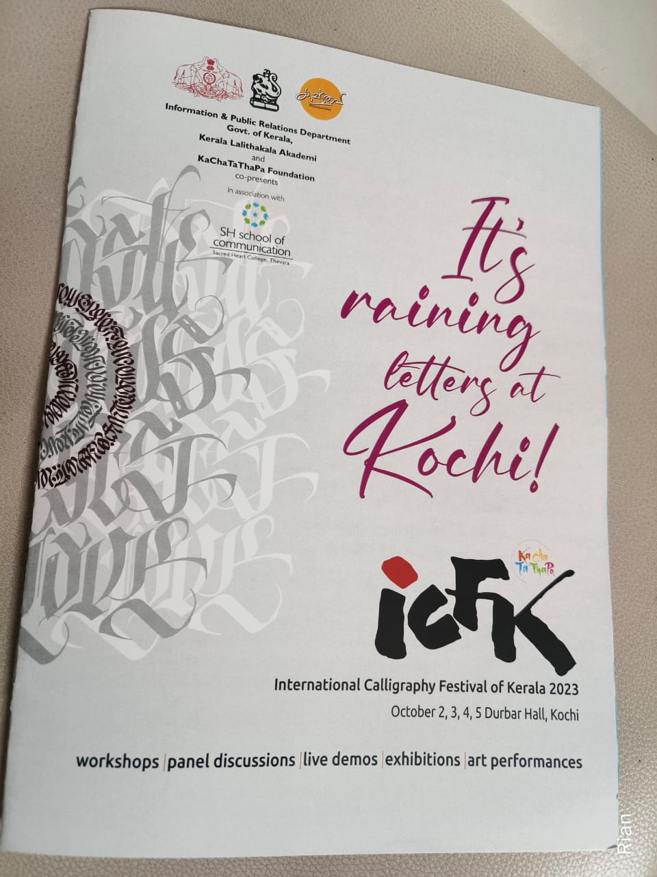 ICFK is the 1st International Calligraphy Festival of Kerala, an event that celebrates 'the timeless artistry of the written word'. It is organized by the Ka Cha Ta Tha Pa Foundation which envisions to uplift Calligraphy as a recognised and celebrated art form in the State. The event is supported by SH School of Communication, Sacred Heart College, (Autonomous) Thevara.